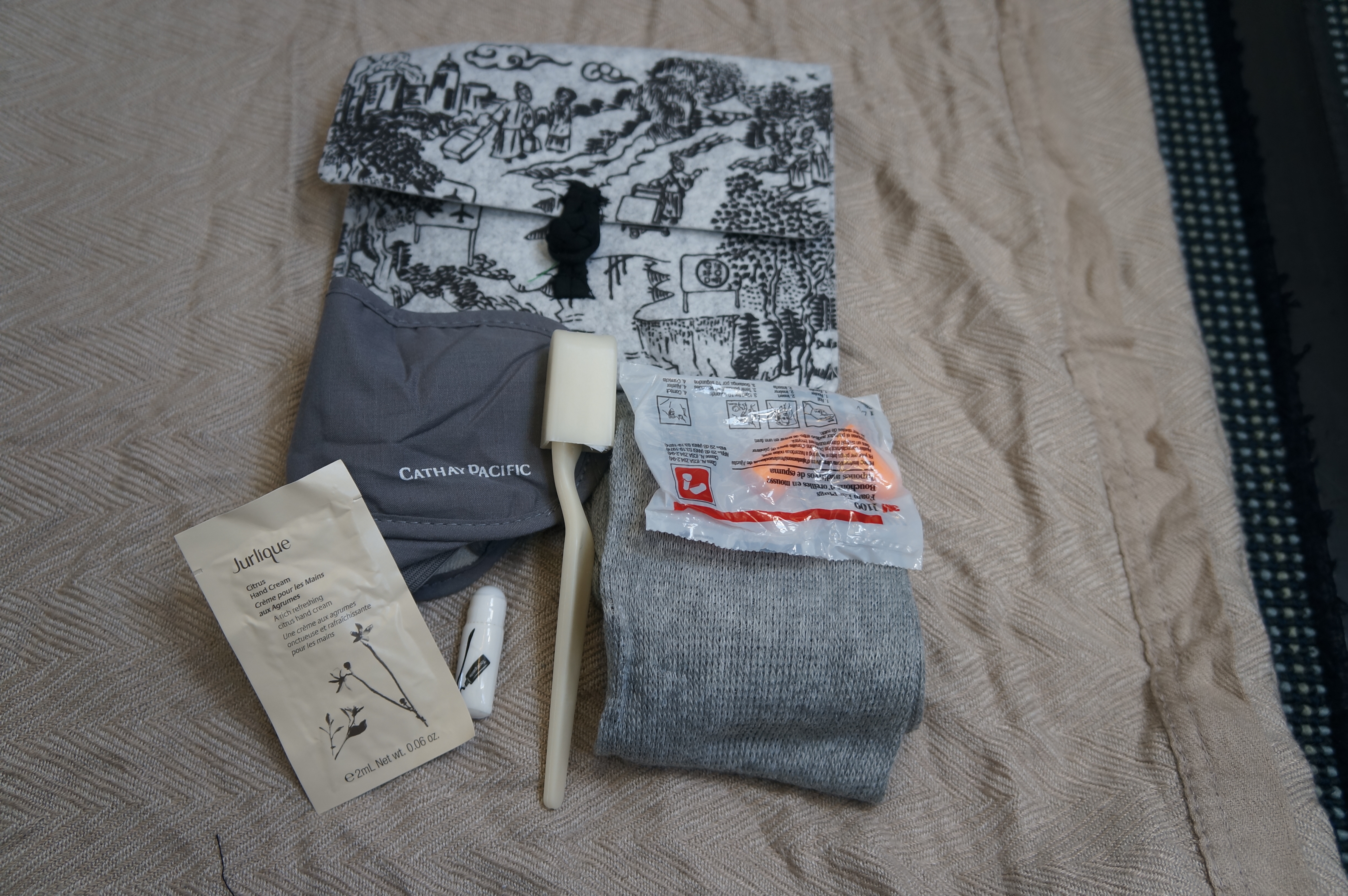 I sip and munch happily and examine my toiletries bag which is a smart black and cream envelope. It comes with instructions on how to collect these and recycle them but I am more interested in the contents which are the usual mask, earplugs, loose socks, toothbrush and small tube of toothpaste which is almost impossible to open and a sachet of Jurlique hand cream which is very annoying because once it is open, what do you do with it. I can feel my skin drying out, and my hands already look wrinkled like dried onion skins so I open the sachet and of course the cream runs all over the place. I prefer a tube that can be sealed.